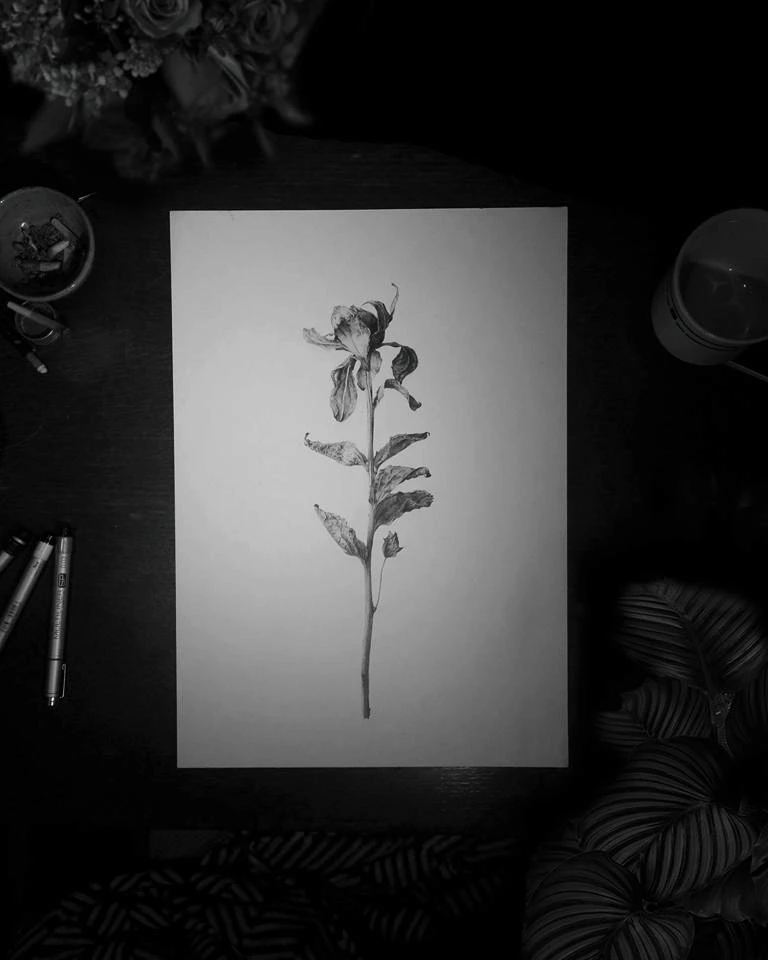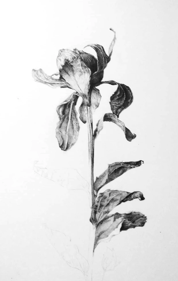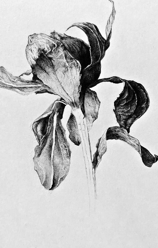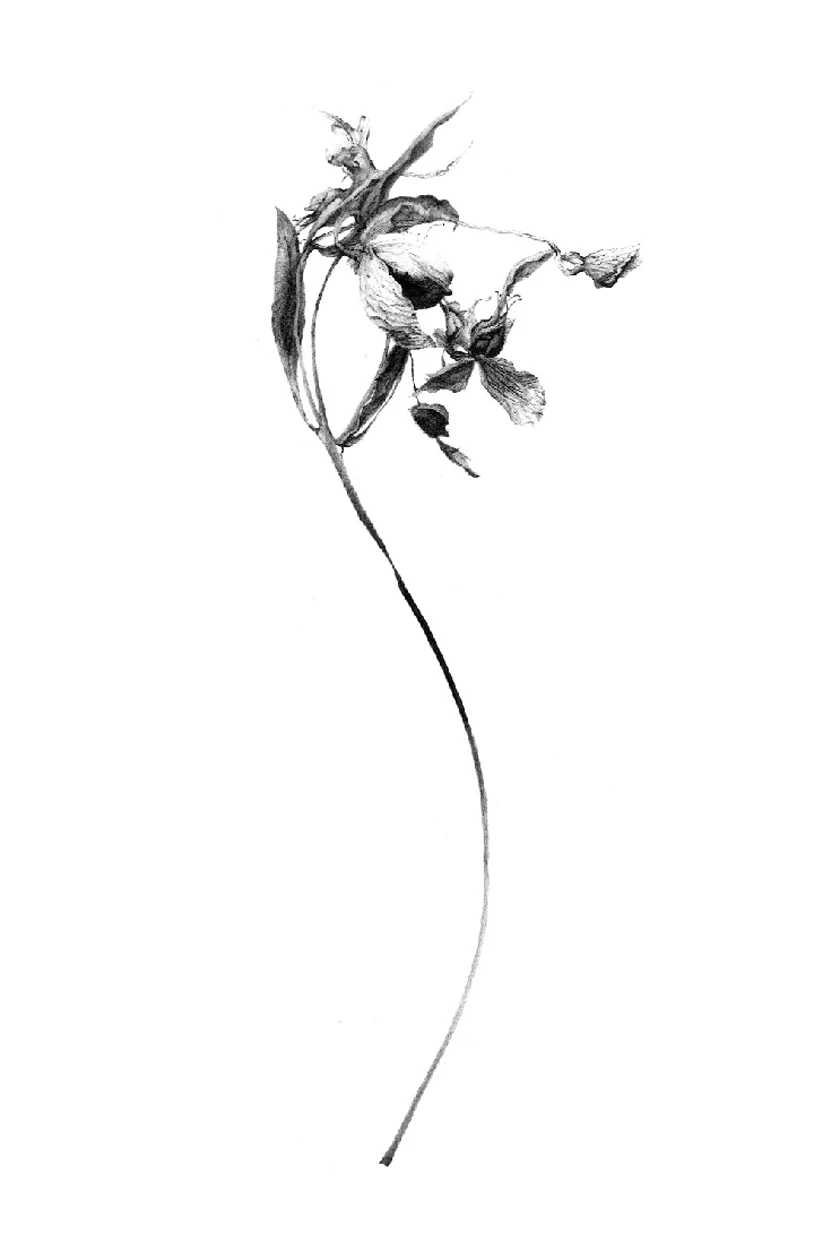Le carthame, une fois sec, conserve une forme compacte et anguleuse. Le dessin insiste sur cette résistance, entre végétal et minéral. Le travail a été conduit à partir d’observations à la loupe, pour isoler les fibres et les restes pigmentaires. Le rendu privilégie le contraste et la densité du trait, dans une logique presque graphique plutôt que botanique.