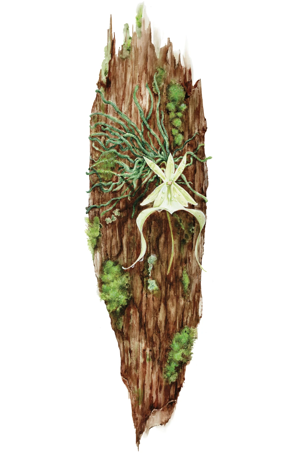 Sans feuilles. Suspendue à l’écorce, la plante se réduit à des racines, filaires, vivantes. L’orchidée fantôme ne se montre qu’en fleur : blanche, fine, arachnéenne. Le reste du temps, elle se confond avec le support qui l’abrite.