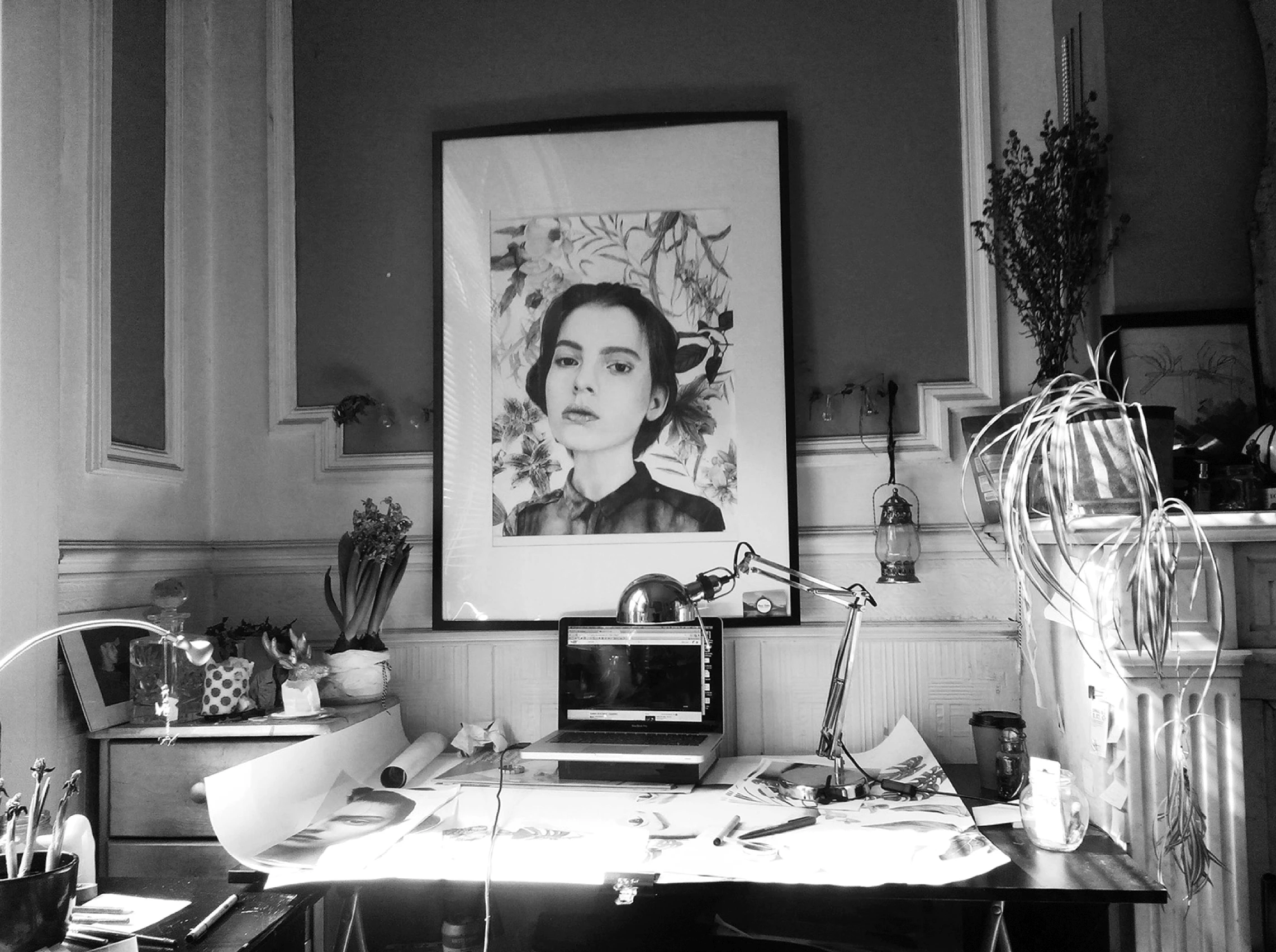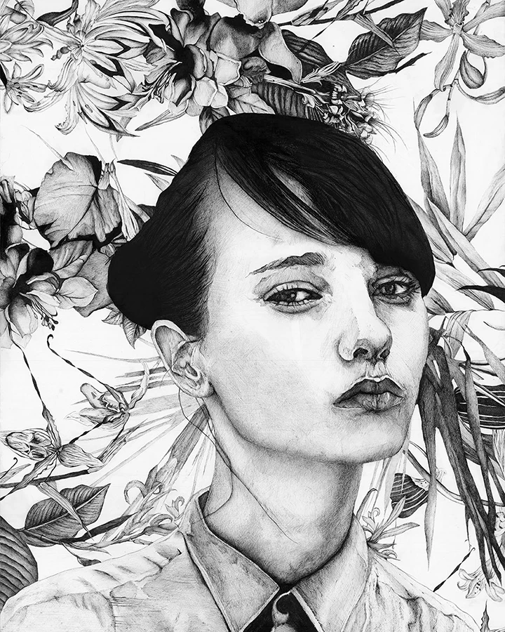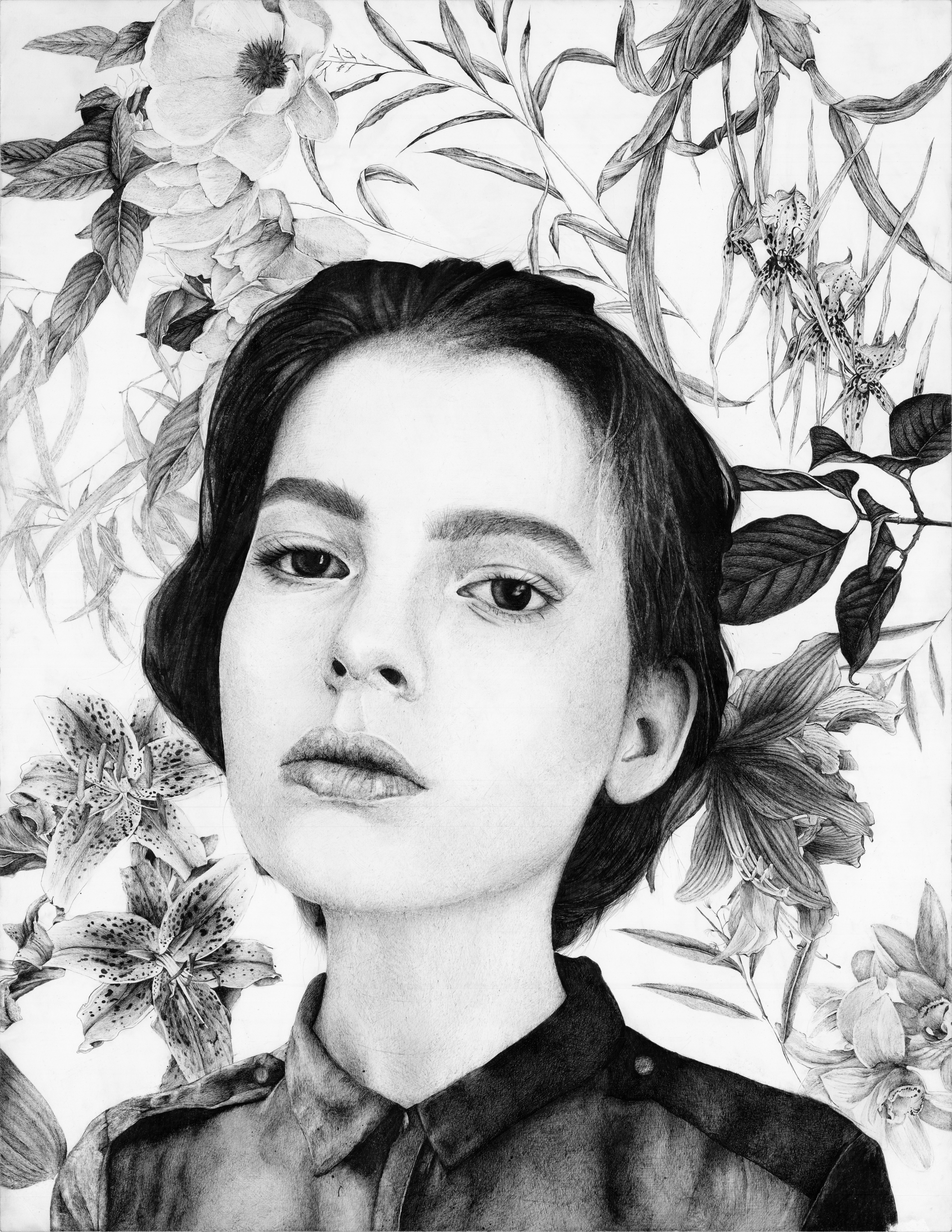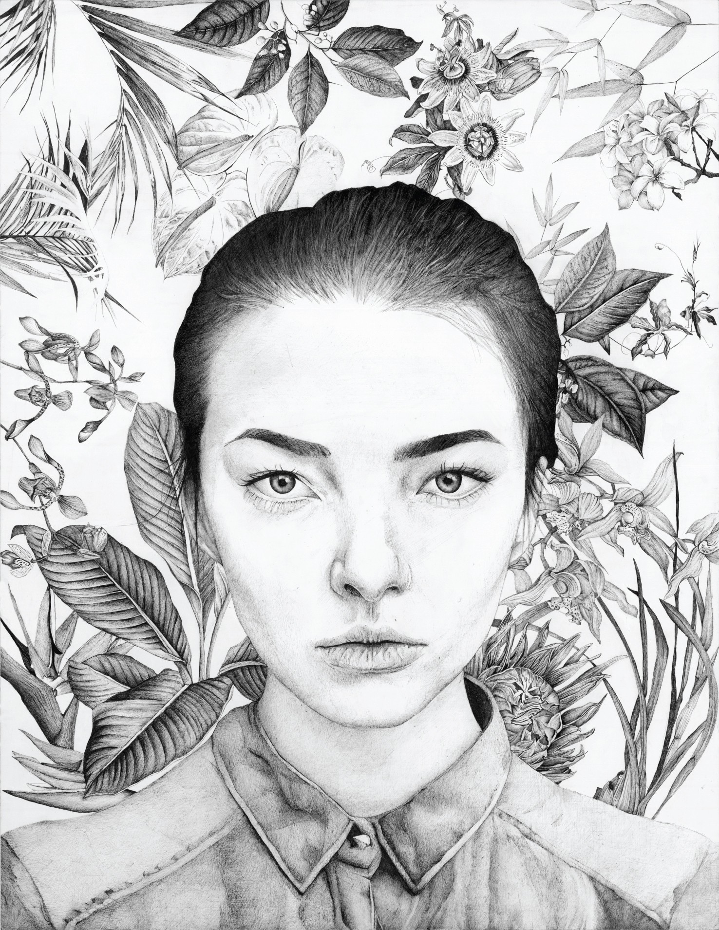 Visages frontaux, regards incisifs. À travers une technique minutieuse au bic noir, cette série explore la tension entre douceur et défiance, identité et projection. Chaque figure s’impose, ancrée dans un décor floral presque invasif, comme pour souligner une forme d’ironie dans la juxtaposition des genres : ce qu’on attend d’un portrait féminin, et ce qui s’en dégage ici.