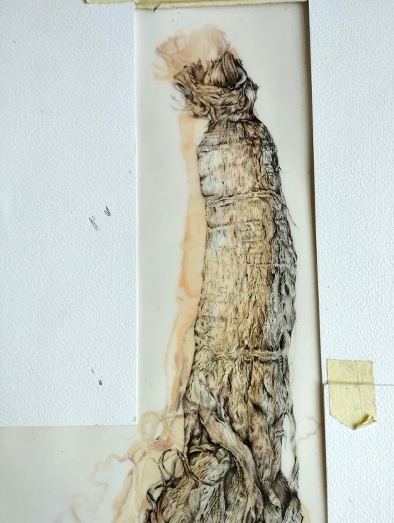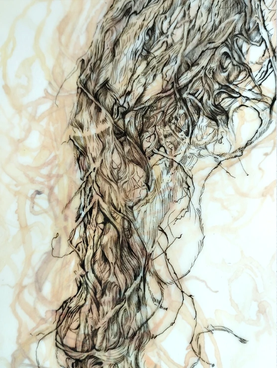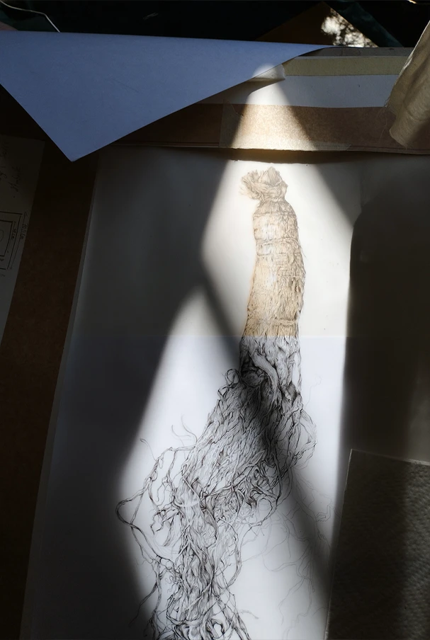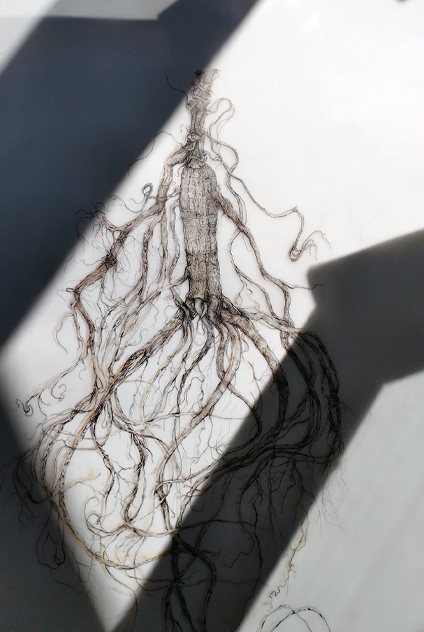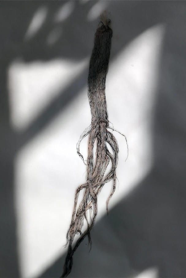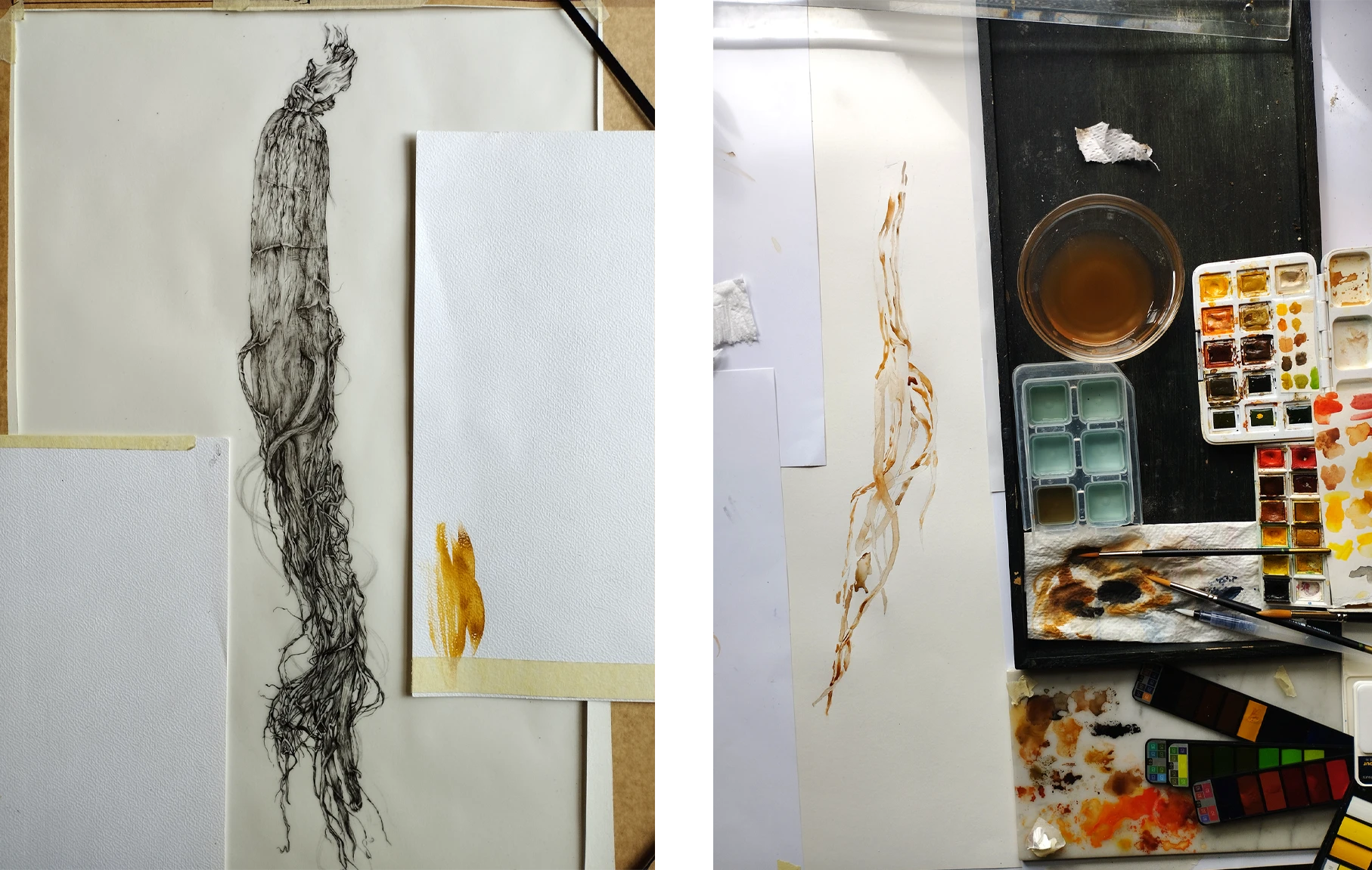 Chaque planche associe deux techniques complémentaires : un dessin précis au Staedtler noir, réalisé sur papier calque, et une aquarelle placée en dessous, jouant sur les masses, les ombres, les teintes. Cette superposition introduit une lecture double : anatomique et sensible. Le calque permet de révéler les formes sans les figer, tandis que l’aquarelle donne une matérialité plus organique, presque tactile, à chaque racine.
