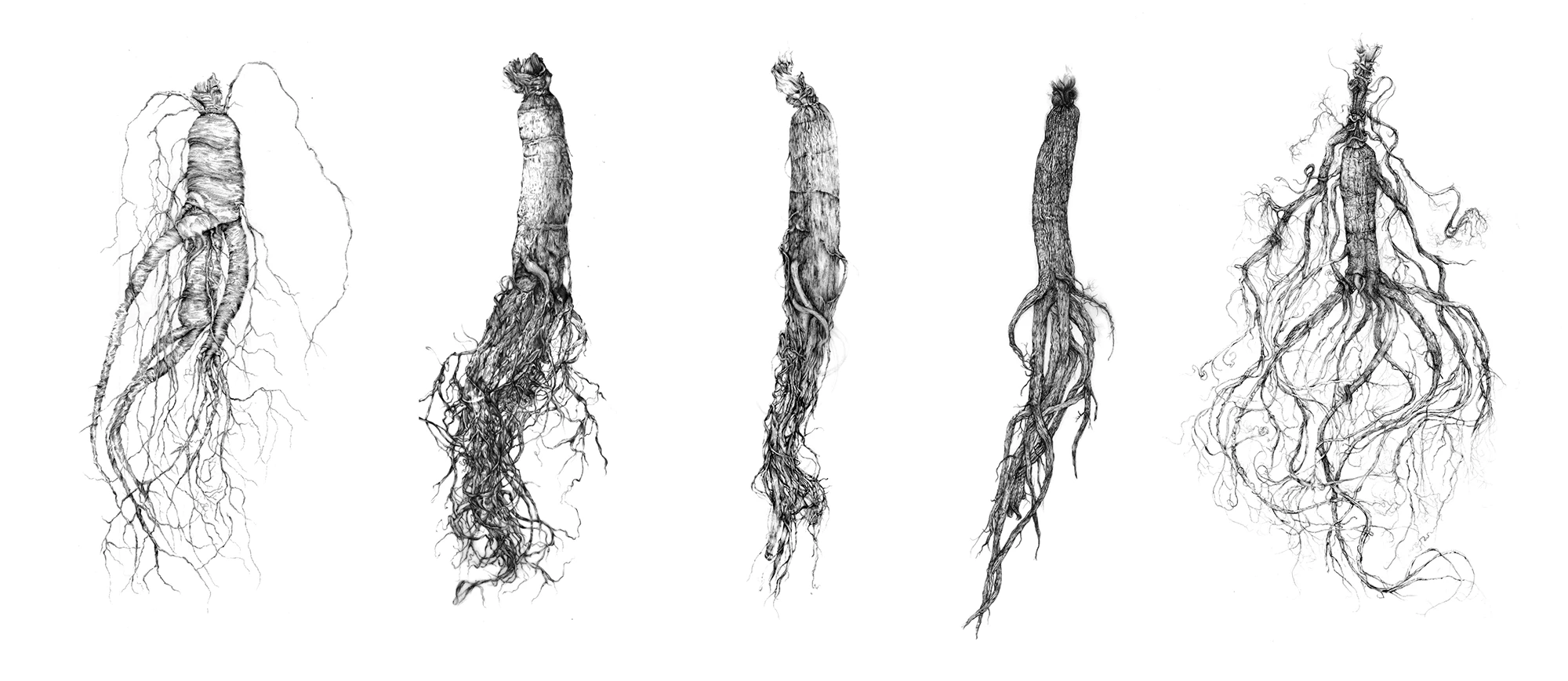 Cette série met en regard cinq formes de ginseng — sauvage, blanche, rouge, noire et fraîche — pour souligner les variations visuelles, pharmacologiques et symboliques d’une même racine. Chaque version est représentée en grand format (A2), en respectant les particularités de texture, de découpe, de couleur. Le traitement différencié souligne ce que l’œil ne perçoit pas toujours : le travail, la transformation, le vieillissement, le statut.
