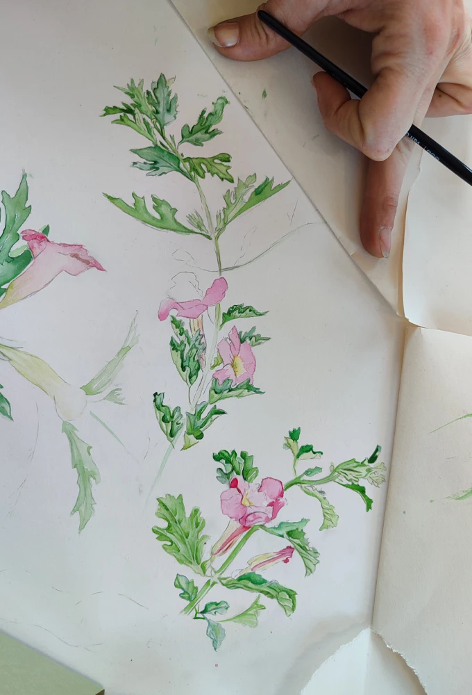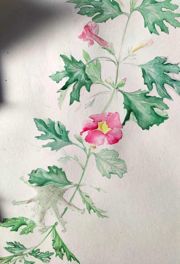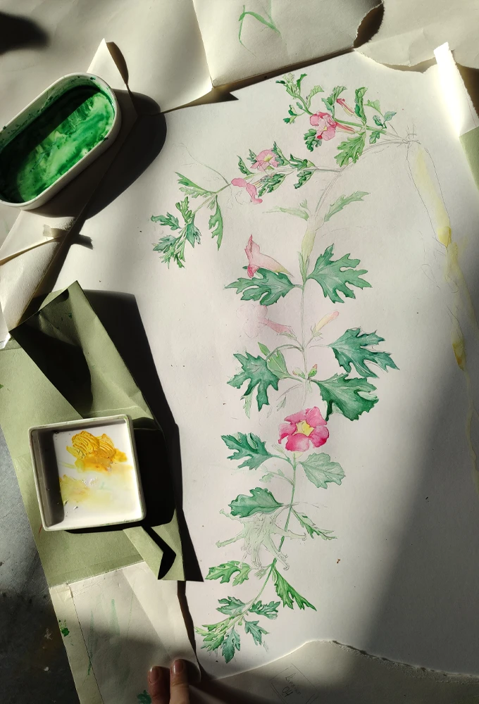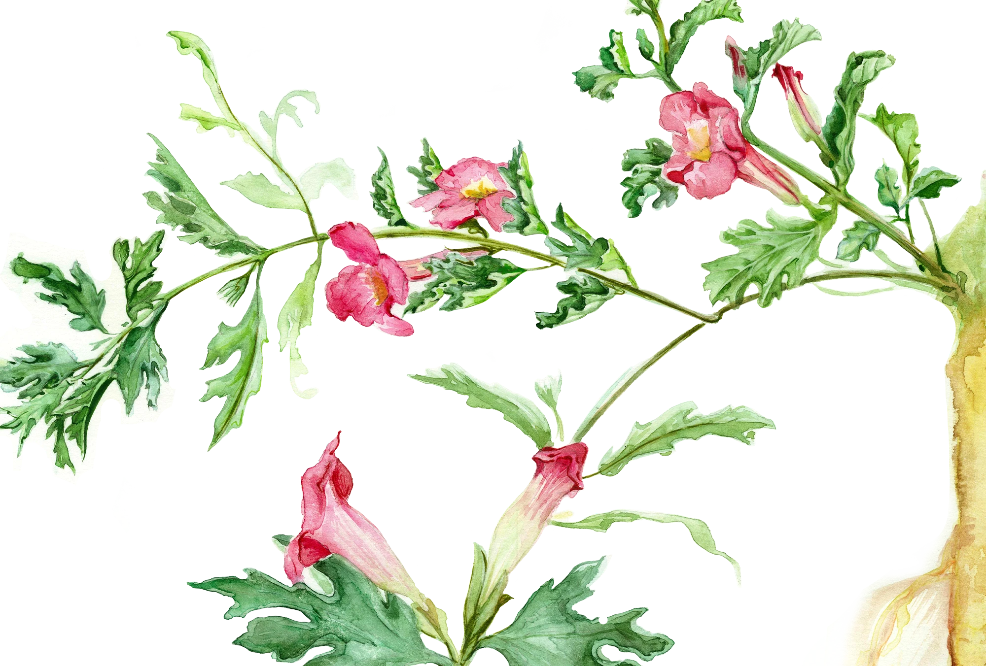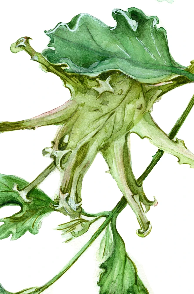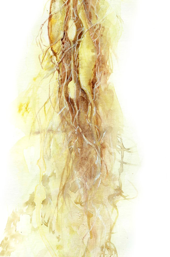 La dynamique radiculaire s’impose visuellement. Les ramifications s’entrelacent comme des tensions internes. La fleur, légère, tranche sur l’enchevêtrement du bas. L’ensemble forme une trajectoire horizontale, résistante, vivante.