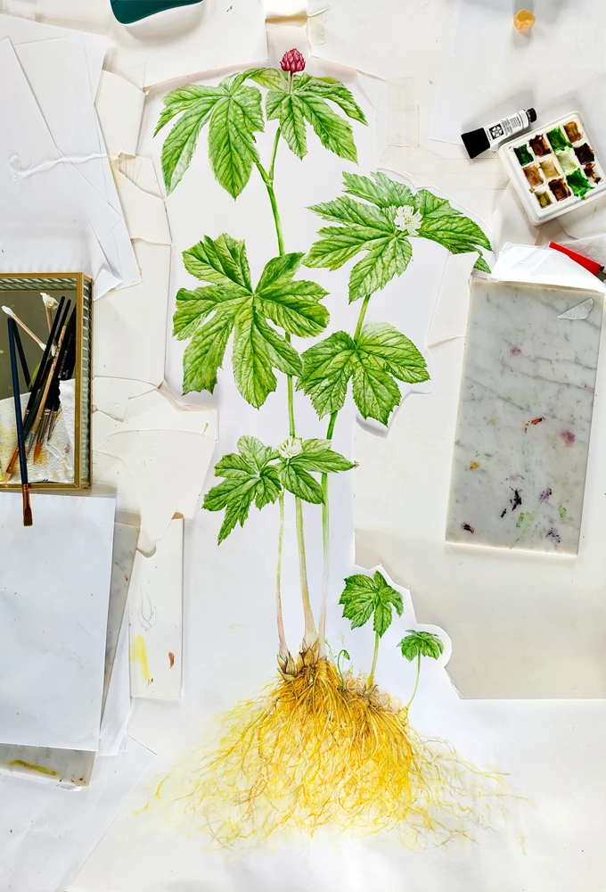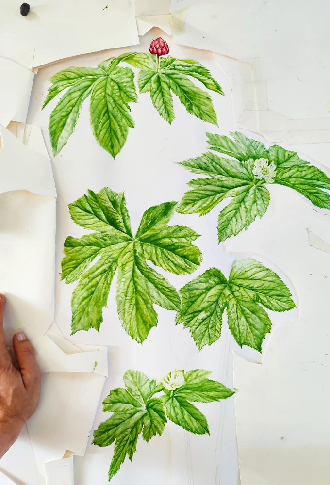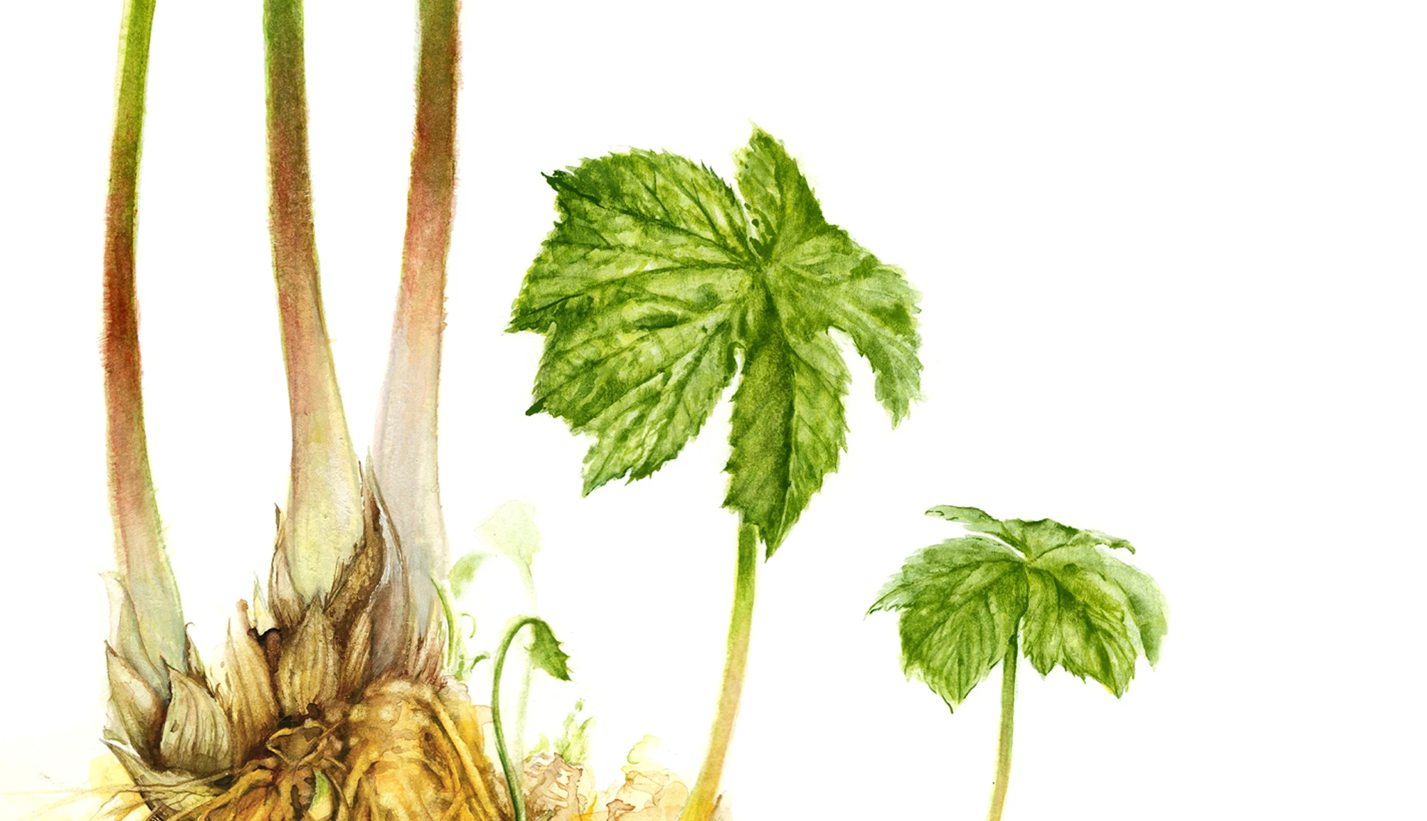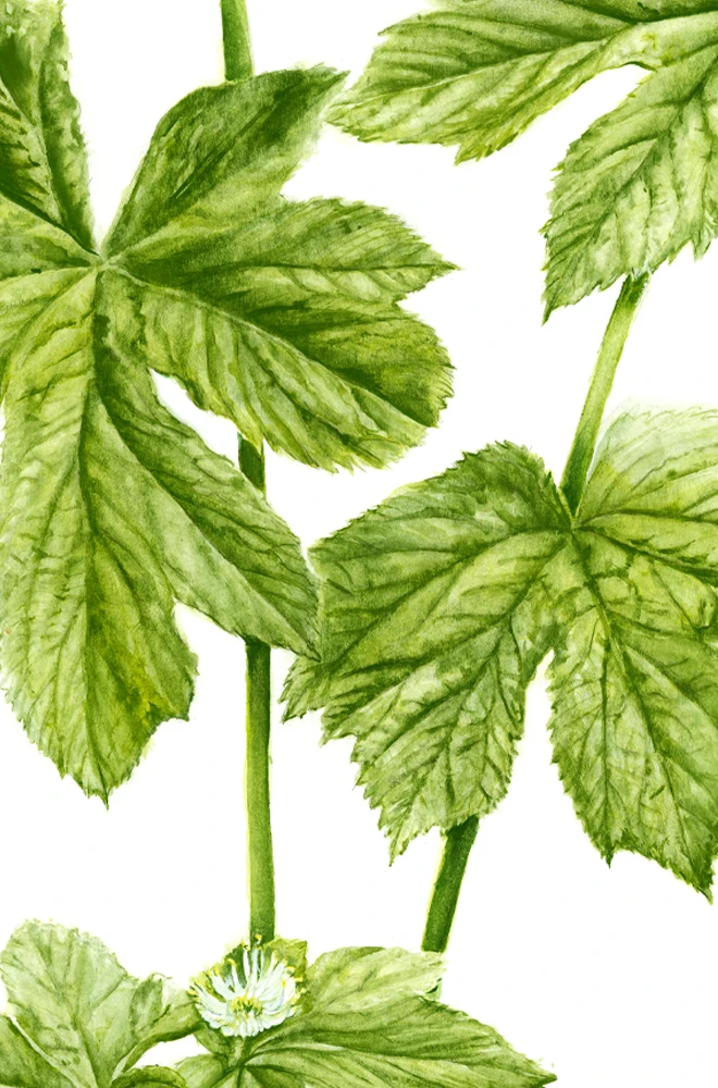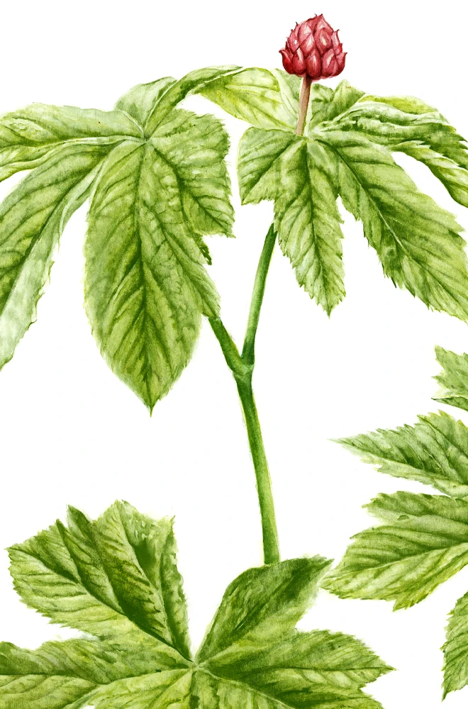 Sous les feuillages denses de forêts nord-américaines, l’hydrastis pousse lentement, ramassée, presque secrète. Ses feuilles larges évoquent une main aux nervures marquées, tandis que la racine jaune, noueuse, se cache sous la litière humide.