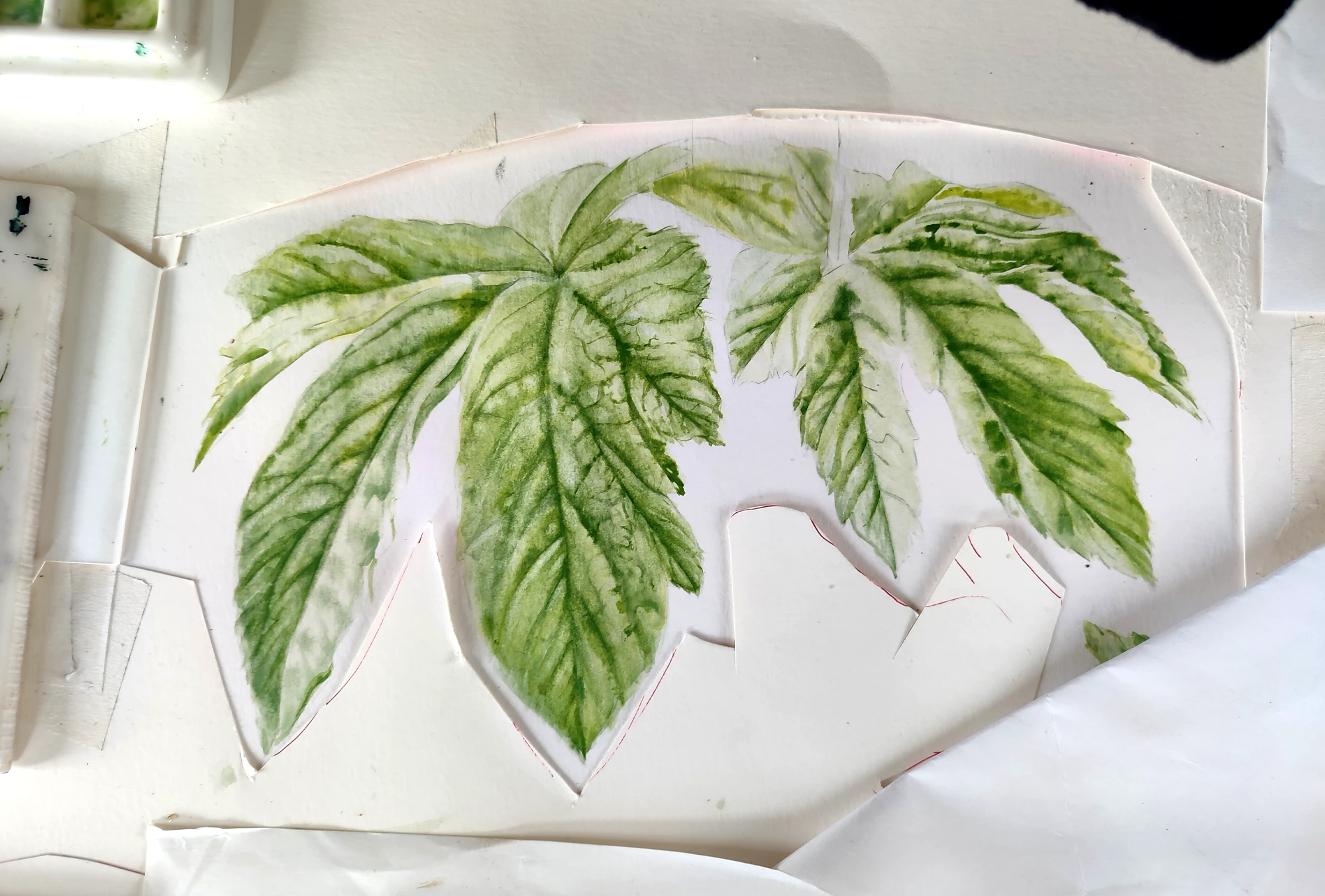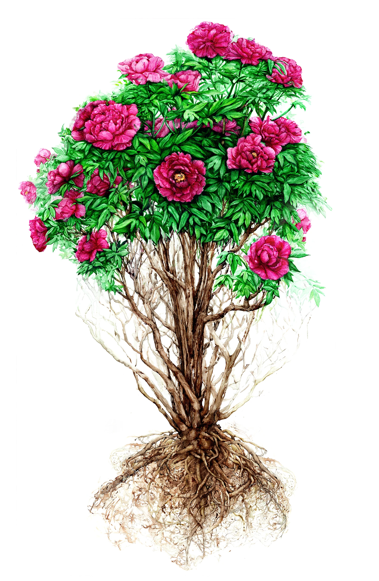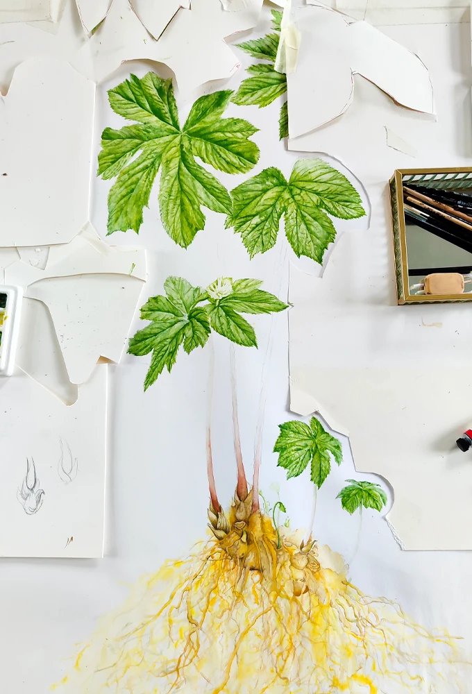 Le rhizome occupe ici le premier rôle. Teinté d’ocre intense, il tranche avec le feuillage vert foncé. L’équilibre se joue entre saturation et retrait : une plante modeste en surface, mais visuellement ancrée, presque tellurique.