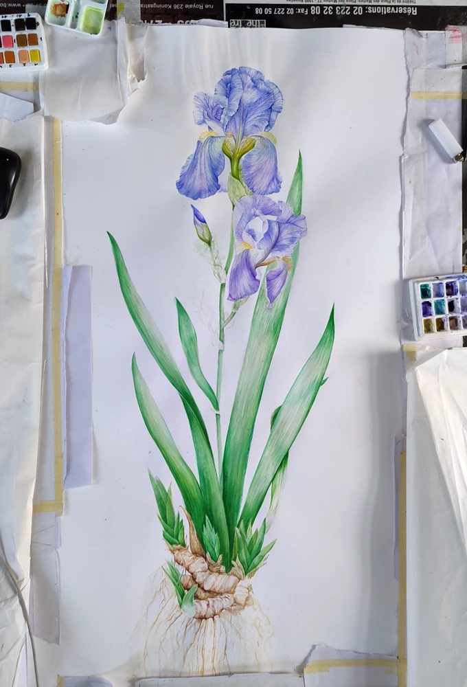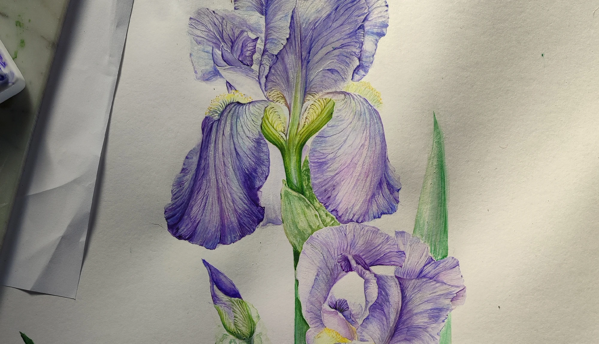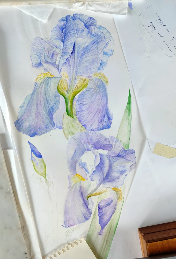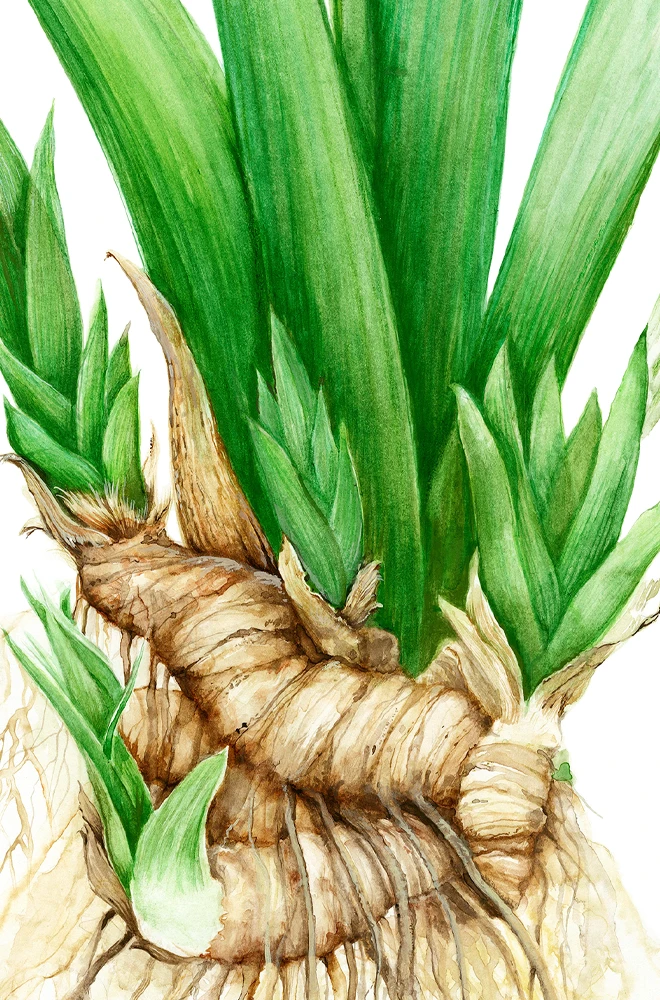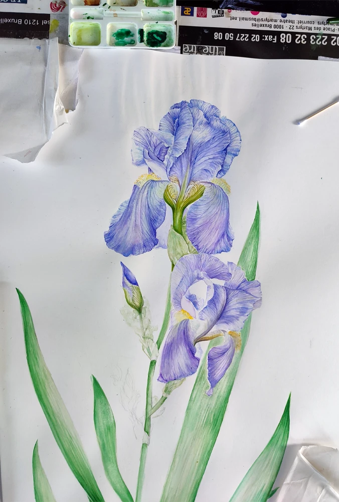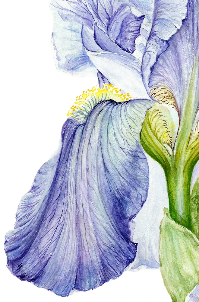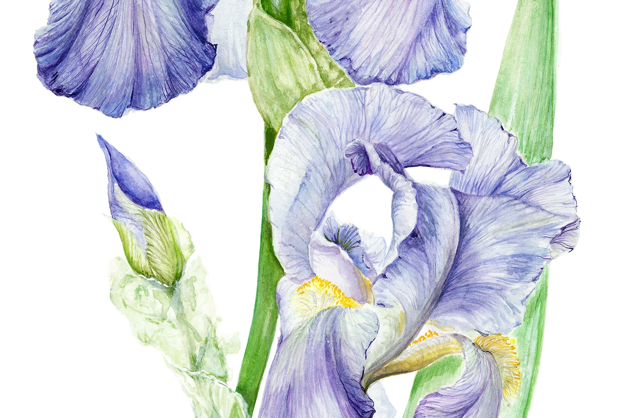 Jeu de verticales nettes et d’irisations douces. Le contraste entre la précision du feuillage et le fondu de la fleur permet d’évoquer la dualité de l’iris : force architecturale et subtilité olfactive. Le rhizome est figuré dense, sculpté.