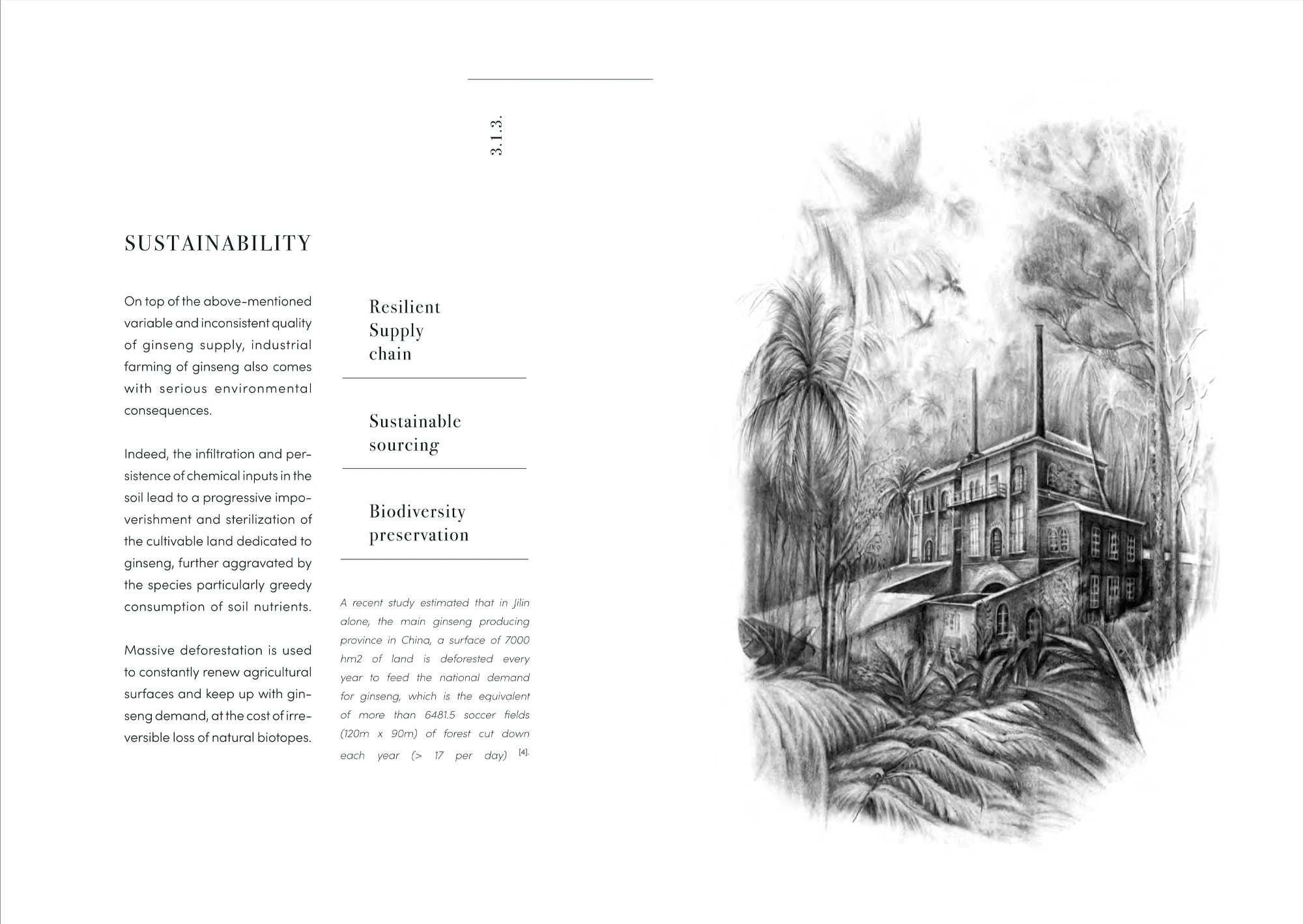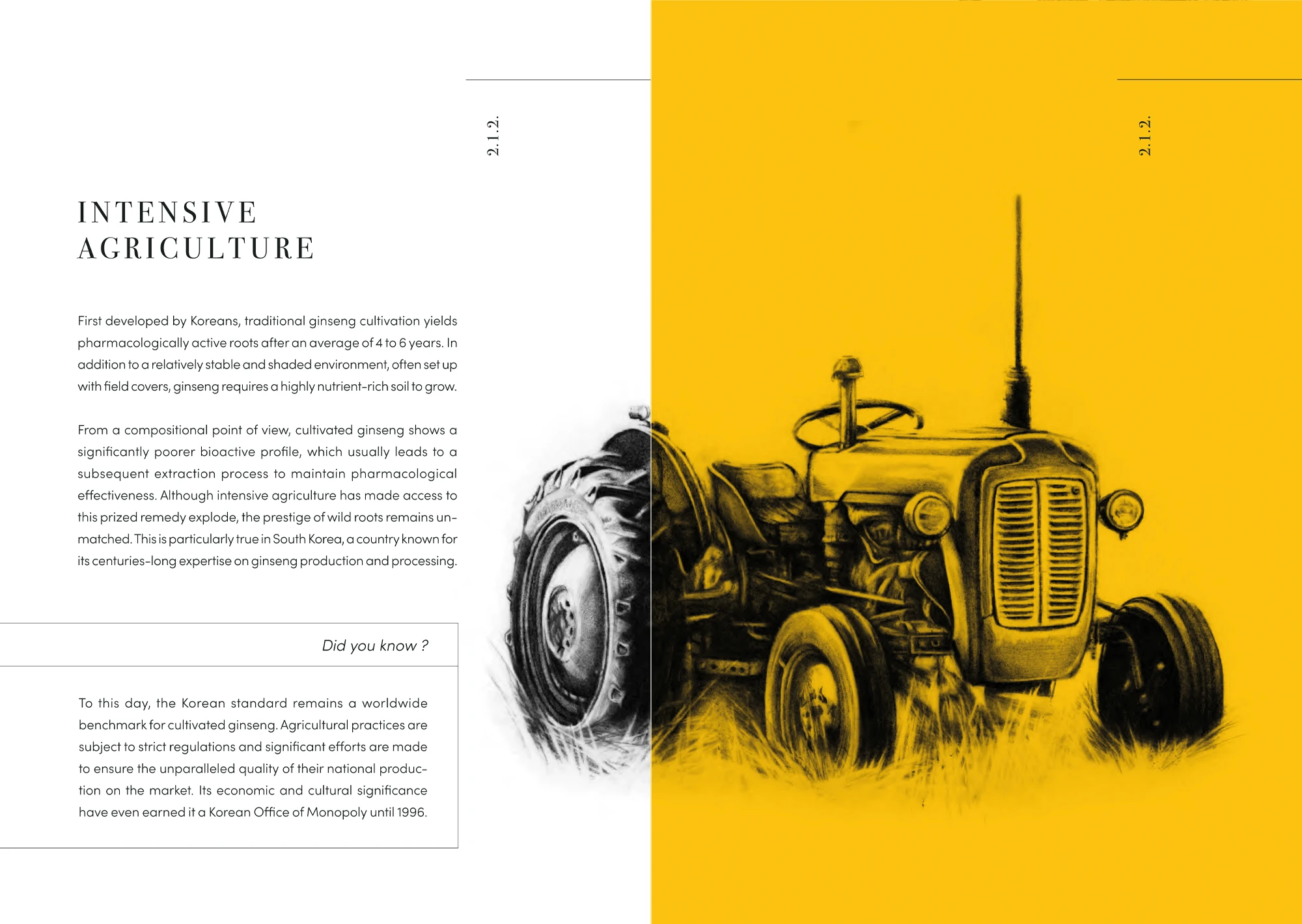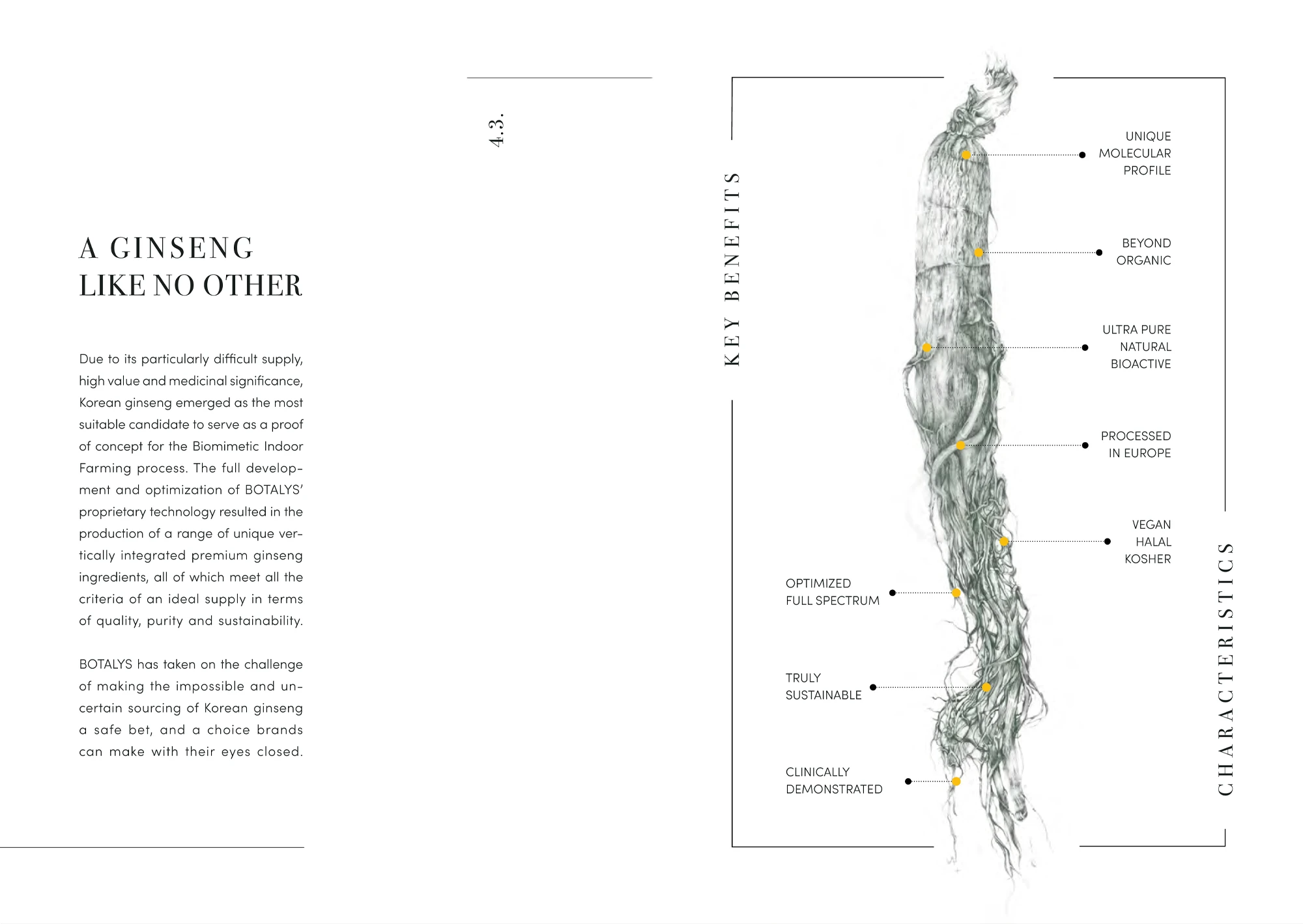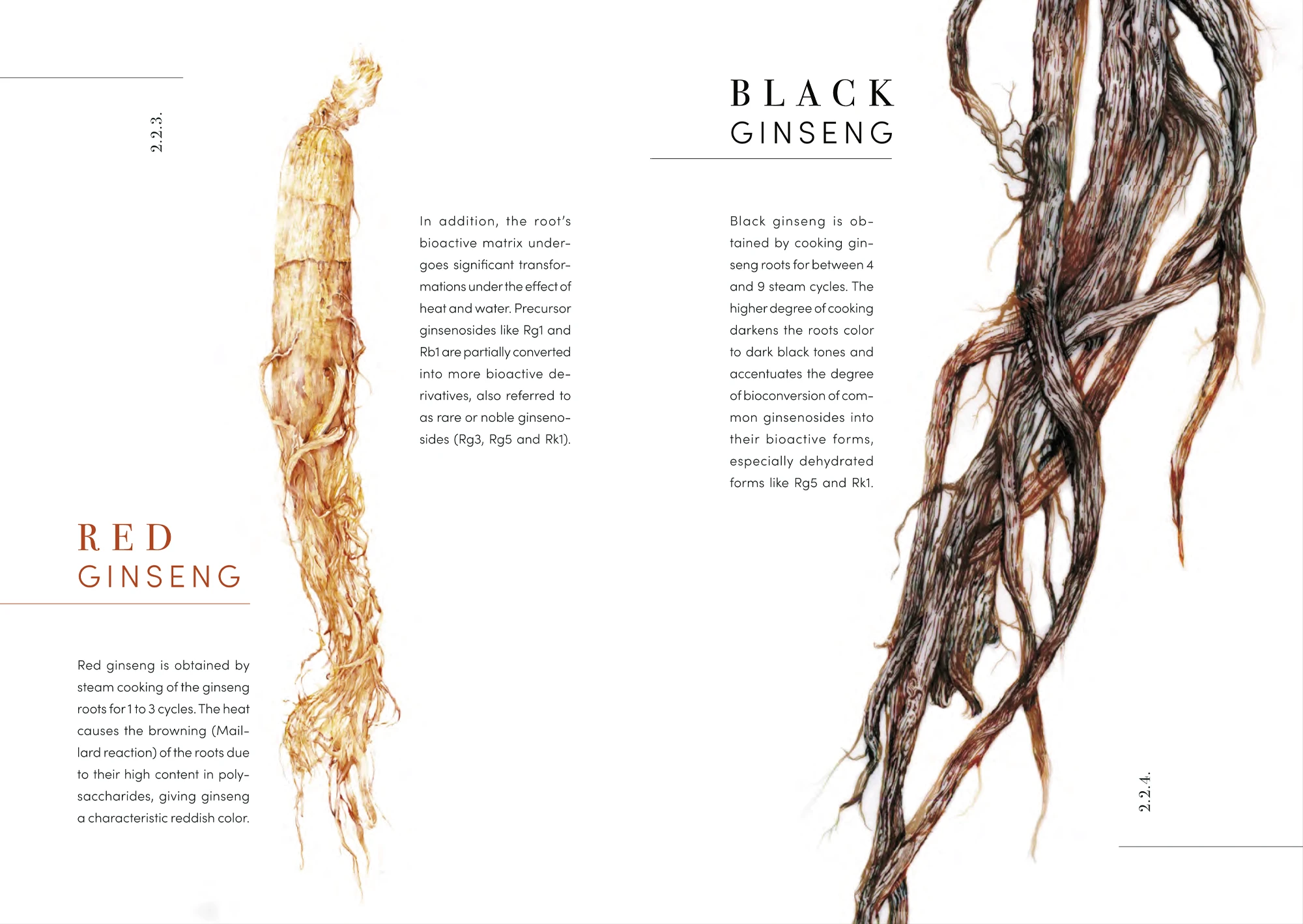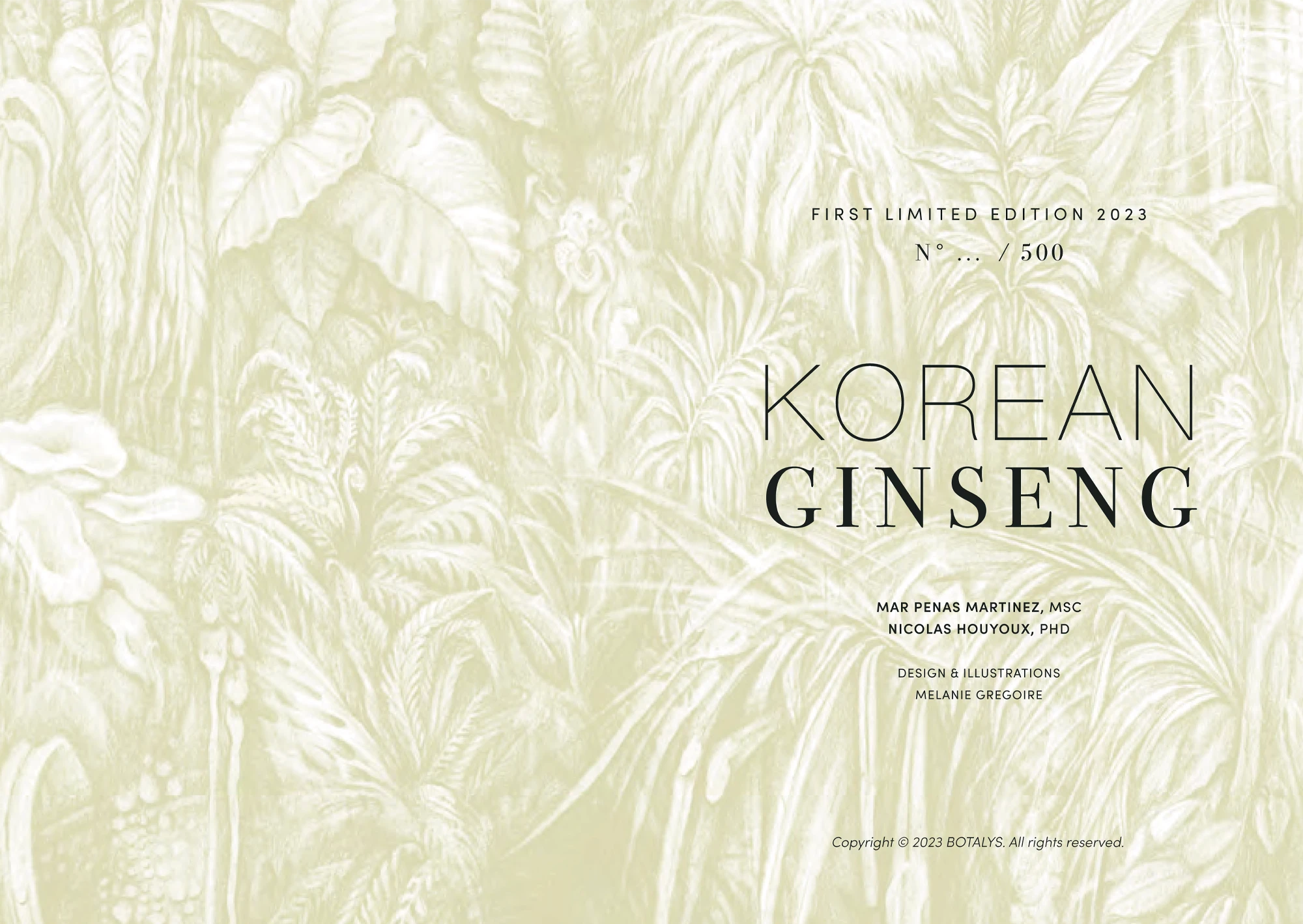 Ce livre a été conçu pour Botalys à l’occasion d’une édition spéciale autour du ginseng coréen. Tiré à 500 exemplaires, imprimé en offset avec une couverture rigide, il combine exigence éditoriale et soin du détail. Le design s’ancre dans l’univers scientifique et végétal de Botalys, tout en affirmant une identité visuelle forte : usage du vernis sélectif, mise en page claire, contrastes de textures et choix typographiques précis.