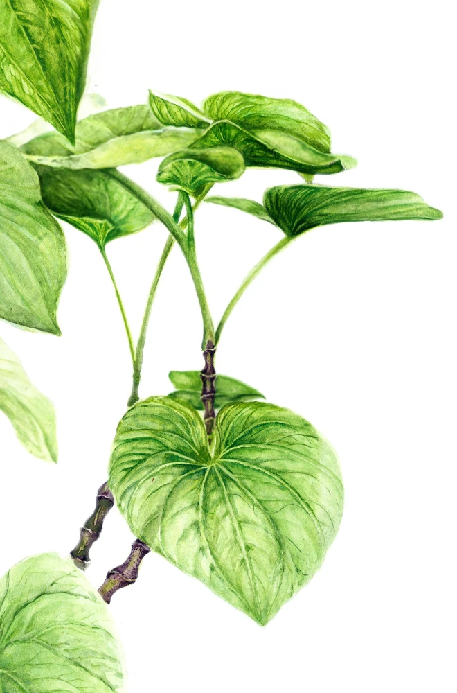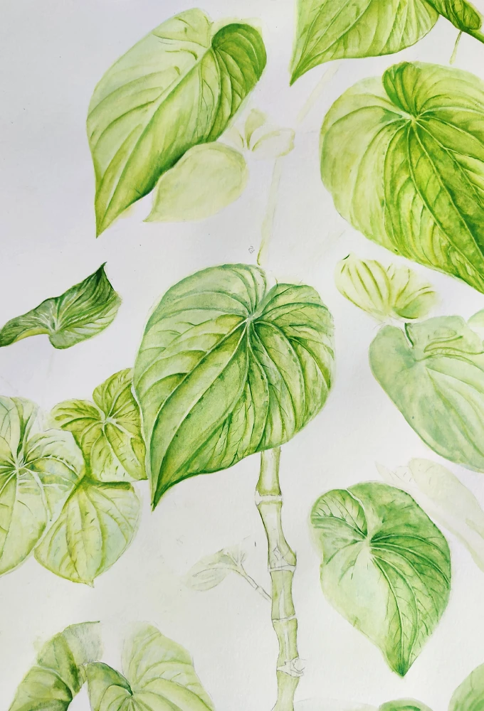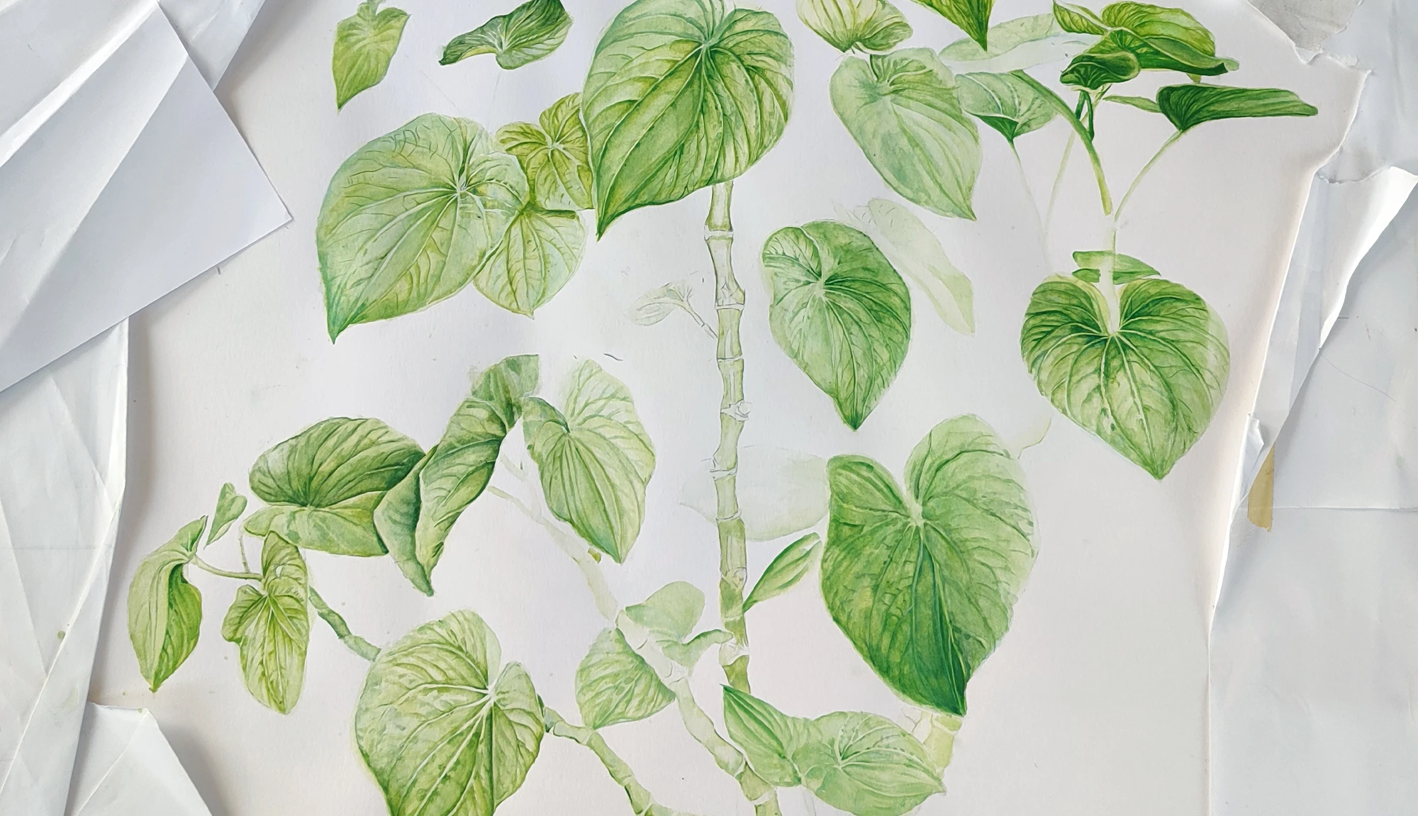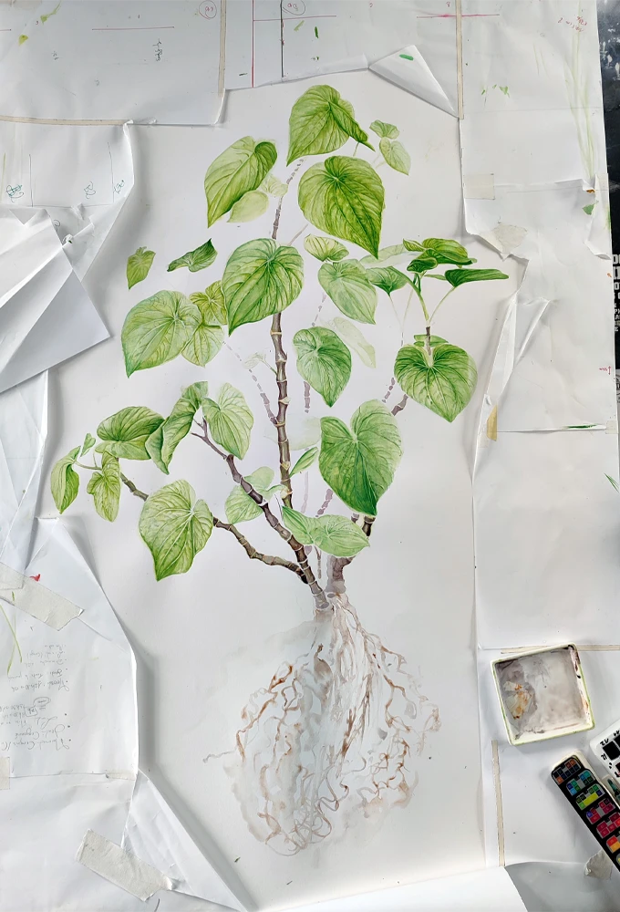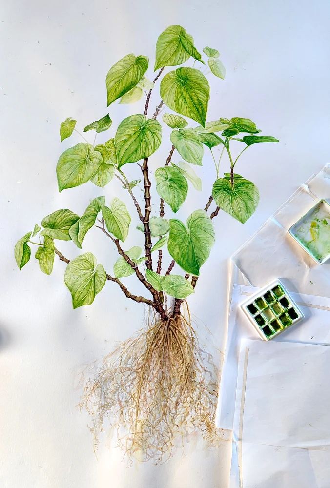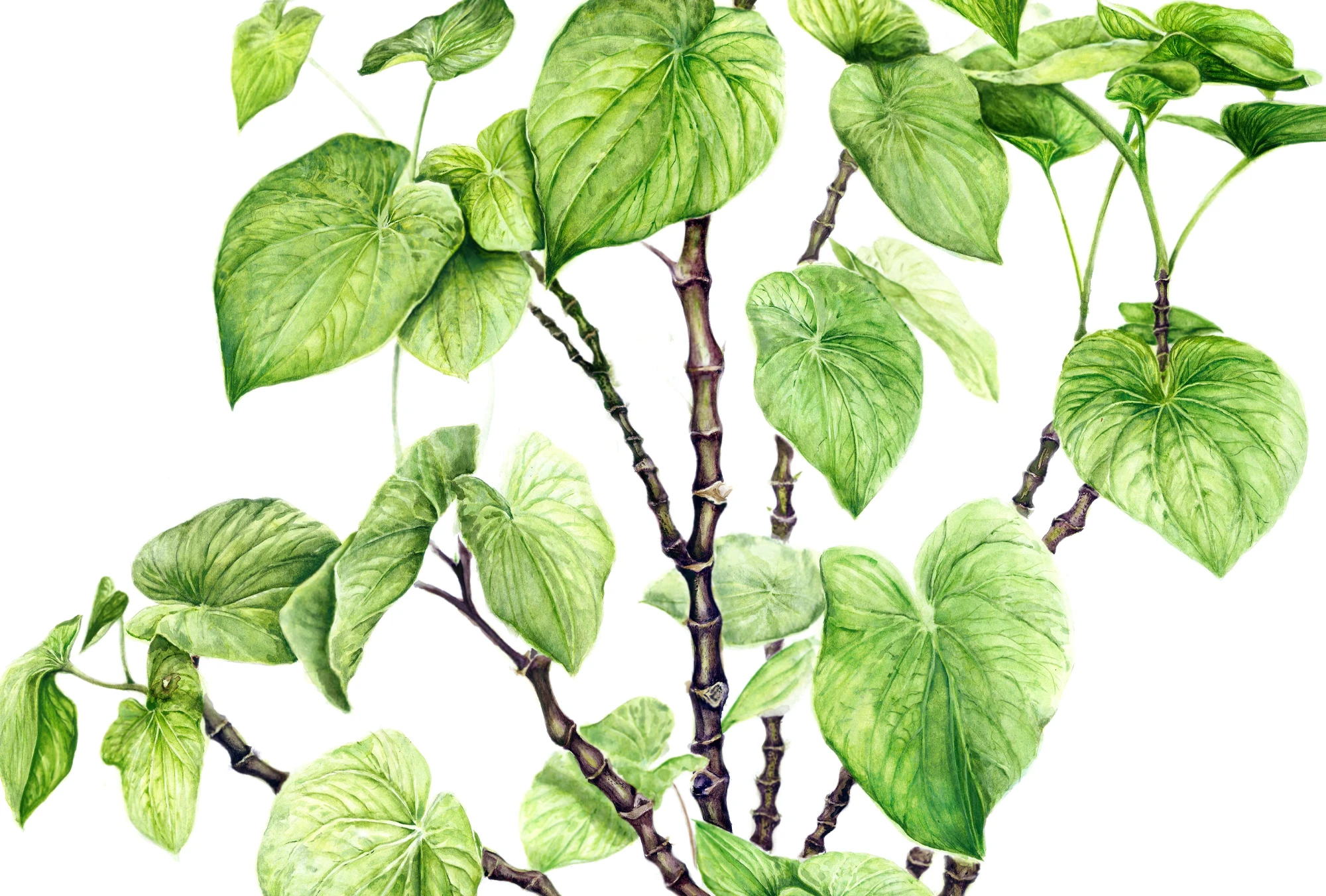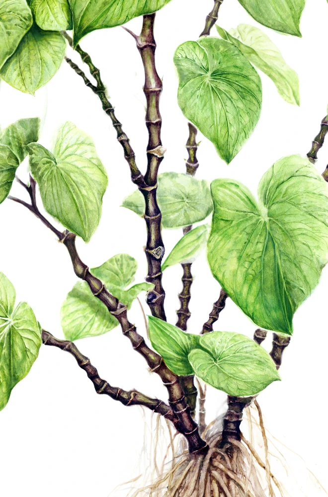 La masse du feuillage occupe l’espace, lourde mais harmonieuse. L’aquarelle s’appuie sur la nervation, les oppositions de verts, pour faire sentir l’épaisseur de la plante. La racine, travaillée en enchevêtrements, matérialise la densité du Kava.