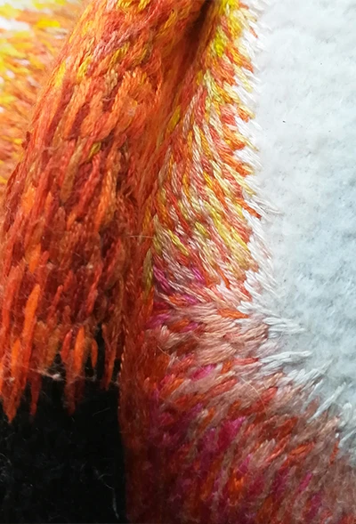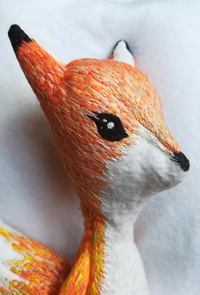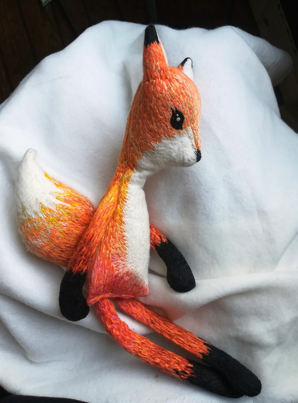 Rena est une renarde née d’un fil à l’autre, patiemment brodée à la main dans ses moindres détails. Chaque poil de son pelage a été cousu un à un, mélangeant fils orange, roux, jaunes et blancs pour créer une texture vibrante, presque vivante. Entièrement cousue à la main, elle n’existe qu’en un seul exemplaire.